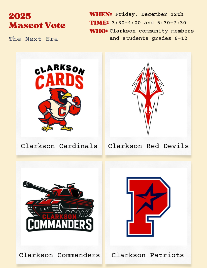 We invite all Clarkson patrons and students to help select our school mascot by casting their vote in person at the Clarkson Public School lobby. Voting will take place on Friday, December 12th during two time windows: 3:30-4:00 and 5:30-7:30. This opportunity is reserved exclusively for Clarkson community members and students, and your participation is an important part of shaping our school spirit and identity. We encourage everyone eligible to stop by during one of the designated times and make their voice heard as we choose a mascot that represents the pride and unity of Clarkson!
